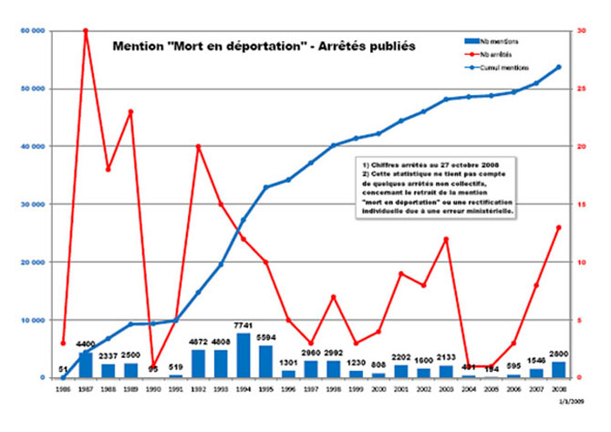 À propos de ce dossier : je crains fort que la situation se soit encore aggravée depuis quelques mois, puisqu'on ne compte actuellement que trois arrêtés ministériels nominatifs pour 2010, totalisant environ 700 mentions « mort en déportation », alors qu'en octobre 2009 le ministère avait assuré le Médiateur de la République qu'on pourrait aller jusqu'à 3 000 mentions par an...