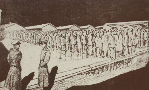 Zu funf ( en rang par cinq ) nous attendons. Il fait froid. On nous compte