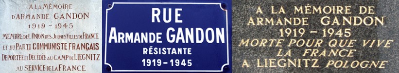 La mémoire d'Armande Gandon à Reims Fiché comme communiste engagé, René Paté est arrêté à Reims par la Police française le 3 juin 1941. Condamné en juillet 1941 à 5 mois de prison par le tribunal correctionnel de Reims pour « menées antinationales », il est incarcéré à Reims, avant d’être transféré à Paris à la prison de la Santé. En août 1941, il est condamné par la Section spéciale de la Cour d’Appel de Paris à 5 ans d’emprisonnement. Il est détenu à Fresnes, puis à la centrale de Melun et finalement à la prison de Châlons-sur-Marne. Transféré à Compiègne, il est déporté le 12 mai 1944 à Buchenwald (matricule 51 320). Il rentre très affaibli en France le 29 avril 1945. Après l’arrestation de son mari, Andrée Paté qui est corsetière, employée à la bonneterie Mazoyer, trouve un emploi aux Verreries mécaniques de Saint-Brice. Elle continue son action dans la résistance aux côtés de Marie-Louise Monin et d’Aline Huon qui constituent avec elle un « triangle ». Ensemble elles animent les « Comités féminins » du Front national de lutte pour l’indépendance de la France et participent à des distributions de tracts, à la rédaction de journaux clandestins, à des transports de machines à écrire et de papier, à des prises de paroles sur les marchés, à des collectes de vêtements pour les clandestins, et au recrutement de FTPF. Andrée Paté a témoigné dans l’ouvrage Souvenirs de déportés rémois de leur arrestation à leur séjour dans les camps de la mort publié à Reims en 1957. Elle n’a pas cessé jusqu’à plus de 95 ans de témoigner avec conviction devant les élèves de collège et de lycée. Le 15 mars 2014, elle a fêté ses 100 ans dans la maison de retraite " Les Opalines " d'Athis près de Châlons-en-Champagnele. La délégation marnaise des Amis de la Fondation pour la Mémoire de la Déportation (AFMD-51) lui a rendu hommage le 18 m Andrée Paté a reçu le titre de Combattante volontaire de la Résistance, mention DIR.