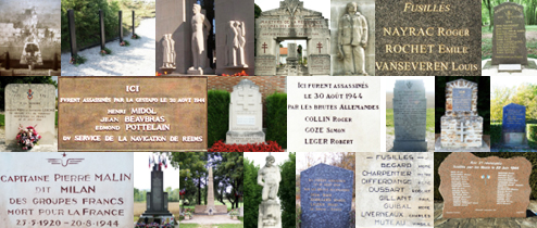 Arrondissement de Châlons-en-Champagne - Châlons-sur-Marne/Châlons-en-Champagne : onze fusillés après condamnation par un tribunal militaire allemand ; un fusillé après condamnation à mort par la cour martiale de la Milice ; deux morts en prison. - L’Épine : trente-huit fusillés après condamnation par un tribunal militaire allemand. - Thibie : huit tirailleurs nord-africains exécutés le 22 août 1944. - Somme-Tourbe : deux civils abattus le 28 août 1944. - Sainte-Ménehould : trois exécutions sommaires au lieu-dit Le Texas le 29 août 1944 ; trois civils exécutés sommairement dans la cour de l’Hôpital le 30 août 1944 ; trois civils abattus dans la rue le 30 août 1944. Arrondissement d’Épernay - Épernay : monument aux martyrs de la Résistance, « Fusillés » et « Tués au combat » ; plaques commémoratives SNCF (Gare et Ateliers) - Moslins : deux FFI abattus le 23 novembre 1943 - Morsains : deux FFI exécutés sommairement le 20 août 1944 - Broyes : deux FFI abattus le 27 août 1944 - Corfélix : trois FFI abattus le 28 août 1944. - Tours-sur-Marne : deux FFI tués au combat le 28 août 1944 - Champaubert : deux FFI tués au combat le 28 août 1944 - Gaye : douze FFI tués au combat, abattus ou morts des suites de leurs blessures le 28 août 1944. - La Celle-sous-Chantemerle : trois FFI tués au combat le 29 août 1944. Arrondissement de Reims - Beine-Nauroy : deux FFI tués dans une embuscade - Chenay : Monument en hommage à la Résistance française ; sur ce monument sont gravés les noms de six hommes originaires de Chenay ou dont les familles avaient noué des liens avec ce village, qui ont été choisis pour rendre hommage à travers eux aux morts pour la France de la 2e guerre mondiale « unis dans l’amour d’une même patrie - Reims : une dizaine de résistants et de civils, abattus, morts en prison ou à l’hôpital des suites de leurs blessures, suicidé en prison ; lieux de mémoire : plaques de maison, square des victimes de la Gestapo, monument aux martyrs de la résistance. - Verzenay : trois patriotes exécutés sommairement le 27 août 1944 dans le secteur de la Ferme de l’Espérance - Brimont : trois résistants exécutés sommairement le 28 août 1944. - Champlat-et-Boujacourt : dix FFI abattus ou tués au combat le 28 août 1944 à la Ferme de Chantereine et un FFI tué accidentellement. Arrondissement de Vitry-le-François - Trois-Fontaines-l’Abbaye : six FFI tués au combat à la Maison forestière de Brassa le 18 juillet 1944 - Vitry-le François : quatre FFI exécutés sommairement le 28 août 1944. - Blacy : trois FFI abattus le 28 août 1944. - Sermaize-les-Bains : douze civils massacrés ou morts des suites de leurs blessures le 29 août 1944. - Cheminon : trois civils abattus le 29 août 1944. - Margerie-Hancourt : monument à la mémoire de 6 FFI exécutés, 2 FFI tués au combat, 2 FFI morts des suites de leurs blessures, 1 FFI porté disparu. Résistants marnais ou liés à la Marne Ain - Billiat, Ferme des Lades : Robert LECOMTE, FFI originaire de Fagnières, mort en action le 8 mars 1944. Aisne - Saint-Quentin-Stand de tir de La Sentinelle : vingt-sept fusillés après condamnation à mort par le tribunal militaire allemand FK 602, parmi lesquels René BÉGARD originaire de Vitry-le-François. - Neufchâtel-sur-Aisne : monument qui honore la mémoire des résistants du groupe Liberté fusillés à Saint-Quentin dont faisait partie René BÉGARD, originaire de Vitry-le-François Ardennes - Tournes, Bois de la Rosière : monument qui honore la mémoire de treize résistants exécutés sommairement en ce lieu, dont trois Rémois, Marie-Thérèse OGNOIS, Paul SCHLEISS, André SCHNEITER, et Henri MOREAU, chef départe-mental du BOA dans la Marne. Aube - Creney-près-Troyes : monument des fusillés-exécutés, qui honore la mémoire de cinquante-trois détenus extraits de la prison de Troyes, exécutés sommairement en ce lieu le 22 août 1944, parmi lesquels se trouvaient cinq FTPF arrêtés à Saint-Just-Sauvage : Bernard BUFFET, René CORNÉLIS, Jean PIERRARD et Roger VACHEZ. Aveyron - La Couvertoirade, La Pezade : Édouard PAYS, résistant inhumé à Reims, tué au combat à Caylar le 22 août 1944. Cher - Bourges, stand de tir der Montifaut : Paulin PECQUEUX, résistant originaire de Reims, fusillé après condamnation à mort le 7 octobre 1943. Côte-d’Or - Cessey-sur-Tille, Ferme de la Lochère : Michel LATARCHE, FTPF exécuté sommairement le 6 septembre 1943. - Dijon, stand de tir de Montmuzard : Camille LAFOSSE, FTPF originaire d’Épernay, fusillé après condamnation à mort le 22 novembre 1942. Côtes-du-Nord, Côtes-d’Armor - L’Hermitage-Lorge, Forêt de Lorge : Jean SIOT, FFI originaire de Condé-sur-Marne, exécuté sommairement en juillet 1944. Corrèze - Tulle : Bernard Henriet, recensé parmi les 99 civils pendus le 9 juin 1944. Dordogne - Brantôme, lieu-dit Besse des Courrières : Pierre ISRAËL, victime civile exécuté sommairement le 26 mars 1944. - Terrasson : René SARRETTE, FTPF mort en action le 25 mars 1944. Gironde - Camp de Souge : Pierre CRASSAT, résistant arrêté à Reims le 24 avril 1942, fusillé après condamnation à mort le 28 juillet 1942 ; Roger BOURDY, responsable du Front national de lutte pour la libération et l’indépendance de la France dans la Marne en septembre 1941, fusillé après condamnation à mort le 26 janvier 1944. Haute-Vienne - Oradour-sur-Glane : Pierre LEGROS, massacré le 10 juin 1944. Hérault - Castanet-le-Haut, Pont-de-la-Mouline : Pierre BLOT, résistant mortel-lement blessé le 23 août 1944. Indre - Villentrois (Villentrois-Faverolle-en-Berry) : Jean CHALTÉ, FFI exécuté sommairement le 23 août 1944 Jura - Coyron, Pont de la Pyle : Max NONNON, FFI exécuté sommairement le 13 mars 1944. - Larrivoire, La Versanne : Henri PERSEVAL, FFI mort en action le 7 avril 1944. Meuse - Naives-Rosières (Naives-Rosières) : six FFI faits prisonniers à Mat