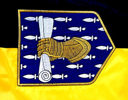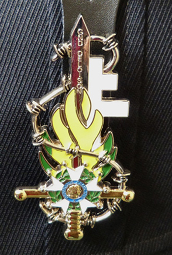 Insigne de la la 444e Promotion de l'École de Gendarmerie de Chaumont « Insigne monobloc au glaive de la Loi, à l'inscription de sable " GND DELOISON ", à senestre une croix de Lorraine de candide issant de sa lame ; chargeant une grenade aux flammes aux couleurs du ruban de la médaille militaire elle-même chargée sur sa bombe de la croix de la Légion d'honneur ; brochant sur le tout et passant sous la lame et la poignée, un fil de fer barbelé ondulant " » - Colonel Jean-Louis Salvador