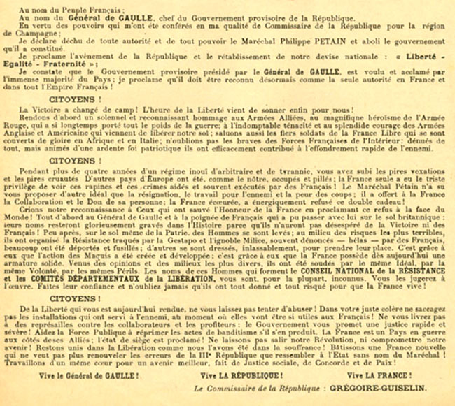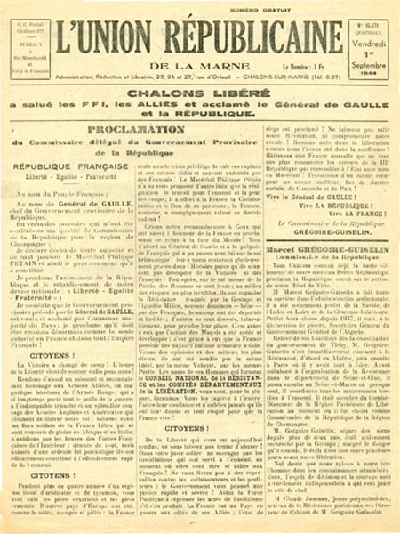 En 1944, Marcel GRÉGOIRE-GUISELIN devenu membre du Comité directeur de Libération-Nord pour la région parisienne, est délégué en Champagne pour y prendre contact avec les Comités départementaux de libération nationale clandestins, et y préparer l’installation de préfets issus de la Résistance.