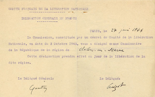 Le 27 juin 1944, la délégation générale en France du Comité français de libération nationale le nomme commissaire régional de la République, chargé dès la libération du territoire de proclamer la République restaurée dans le département de la Marne et la région de Châlons.