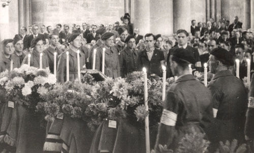 Les trois cercueils recouverts de fleurs en haut de la nef de la cathédrale