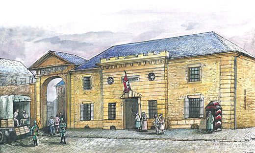 prison Carnot à Charleville Quelques marches, à l'intérieur, un grand hall, deux drapeaux noirs SS brodés d'argent pendent du plafond jusqu'au sol, ou presque : immenses. Et nous tous alignés le long de ce mur, avec un gardien pour chacun de nous. Pas question de bouger ! Le