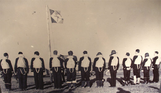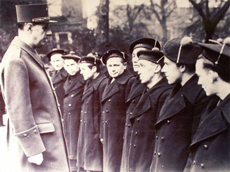 Le général de Gaulle suivi du colonel Monclar ( casqué et portant des lunettes teintées ) passe en revue les premiers volontaires de la France libre Dès
