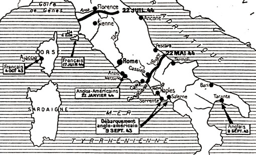 son corps de bataille. À ce moment la situation des opérations dans ce secteur méditerranéen est la suivante : En Sicile, les Anglo-Américains ayant débarqué à la mi-juillet 1943, les Allemands et Italiens évacuèrent totalement le 16 août ce qui provoqua la demande d'armistice italienne début septembre et la chute du fascisme. La Sardaigne, a été occupée par les Anglo-Américains dès la mi-août 1943. La Corse était sous contrôle italien suivant une clause de l'armistice 1940. Dès l'annonce de la demande d'armistice italien, les Corses se soulevèrent, ce qui provoqua l'arrivée de renforts allemands pour mater la résistance, et la réplique immédiate du général GIRAUD par l'envoi de troupes françaises parties d'Alger, et trois semaines plus tard la Corse devint le premier département français libéré. L'Italie du Sud : la conquête de la Sicile terminée, les Anglo-Américains préparent immédiatement le débarquement en Italie du Sud. Il eut lieu le 8 septembre 1943 au sud de Naples à Salerne et en Calabre où ils se heurtèrent à une résistance acharnée nécessitant l'intervention massive de la marine et de l'aviation ; après trois semaines de combats très indécis, ils entrèrent finalement à Naples le 1er octobre et remontèrent l'Italie en direction de leur objectif principal : Rome ; les Américains à l'ouest, les Anglais à l'est. Après