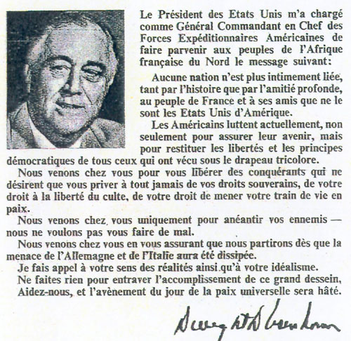 Le général NOGUÈS, commandant en chef en Afrique du Nord, a refusé l'aide allemande qui lui était proposée pour repousser le débarquement allié. Il a déclaré que nous nous en chargions nous-mêmes, ce que très malheureusement il fit jusqu'au 11 novembre 1942, entraînant des pertes inutiles de part et d'autre. Le