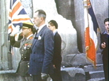 Les personnalités civiles et militaires autour du docteur BILLARD, président de la délégation municipale provisoire mise en place à la Libération, qui vient de déposer une couronne de fleurs et de ranimer la flamme.
