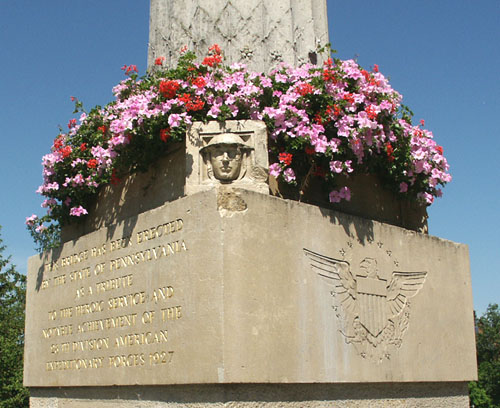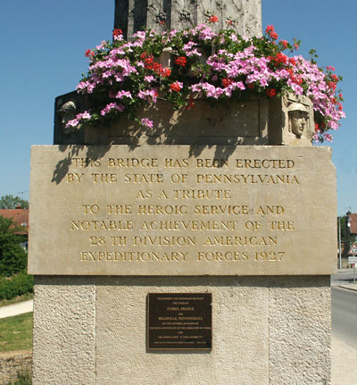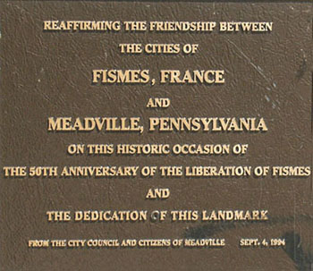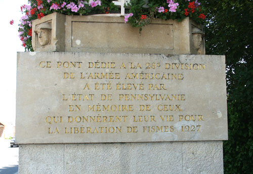pour ralentir l'offensive allemande. Après la 1ère guerre mondiale, la reconstruction du pont de Fismette auquel il était prévu d'adjoindre deux colonnes surmontées de statues et deux lanternes des morts, a été prise en charge par l'État de Pennsylvanie et la ville de Meadville. Le régiment d'infanterie qui a libéré Fismes en août 1918 était parti de cette ville qui souhaitait ainsi honorer la mémoire de ses soldats morts en terre française.
