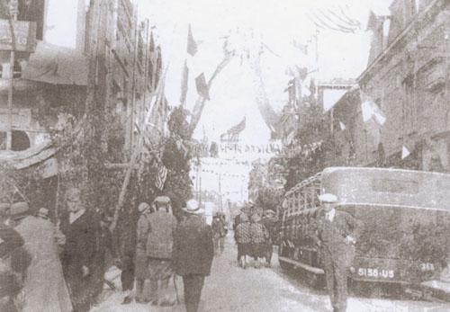 rues de Fismes pavoisées auc couleurs de la France et des États-Unis Détruit à nouveau lors de l'offensive allemande de mai-juin 1940, il a été remplacé durant toute la durée de l'Occupation par une passerelle, puis en 1946 par un pont provisoire.