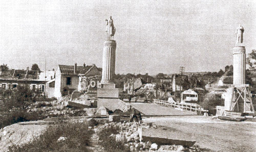 pont de Fismette en juin 1940 Les travaux de reconstruction du pont mémorial qui avait été inauguré en 1928, commencés en 1955, n'ont été achevés qu'en 1958, et la statue décapitée de la Paix n'a retrouvé sa tête qu'en 1994 en même temps que la partie monumentale du pont était toilettée à l'occasion du 80è anniversaire de la Première Bataille de la Marne et du renouvellement du pacte d'amitié scellé entre Fismes et Meadville.