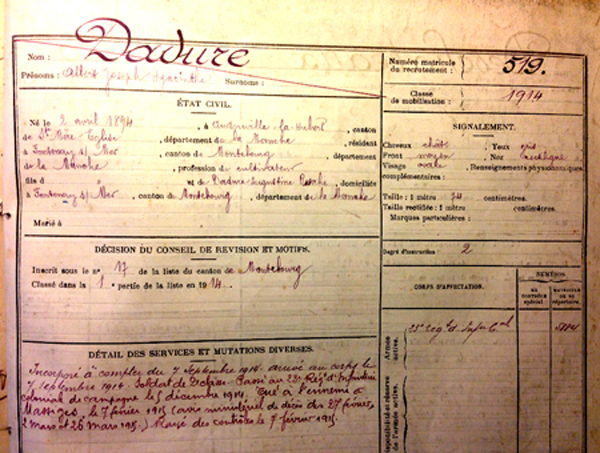 Extrait du livret militaire d'Albert Dadure