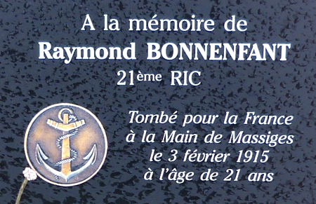 L'hommage au soldat Albert Dadure tué à La Main de Massiges en 1915 Le 21 juillet 2013, au cours des travaux de déblaiement des tranchées, les restes d'un soldat tué et inhumé sur place ont été retrouvés. Grâce à la plaque d'identité qu'il portait au poignet, il a pu être identifié. Il s'agit d'Albert DADURE, jeune cultivateur normand, originaire de Fontenay-sur-Mer, canton de Sainte-Mer-l'Église dans la Manche, incorporé le 7 septembre 1914 au 23e Régiment d'infanterie coloniale de campagne, qui a été tué le 7 février 1915 dans une tranchée française reprise et tenue jusqu'en septembre 1915 par les Allemands.