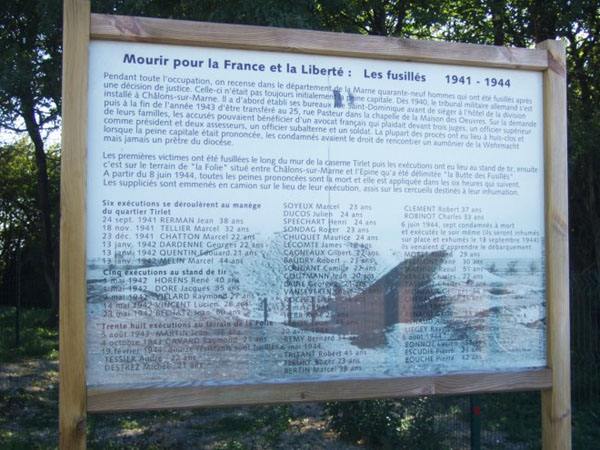 Un lieu de mémoire méconnu et difficile d'accès Dans la Marne, le souvenir des 49 patriotes fusillés après condamnation à mort par des tribunaux militaires allemands pendant l'Occupation est associé à un lieu de mémoire situé sur le territoire de la commune de L'Épine près de Châlons-en-Champagne et désigné soue le nom de Butte des fusillés. Le site de la Butte des fusillés est situé dans le périmètre d'un terrain militaire dit « Terrain de La Folie », où l'on accède depuis la Place de Verdun à Châlons-en-Champagne par la rue du Camp d'Attila et le Chemin de Melette. Depuis 2010, un panneau signalétique balise l’entrée du chemin qui permet d’accéder à la Butte des fusillés où le site a été réaménagé et clôturé.