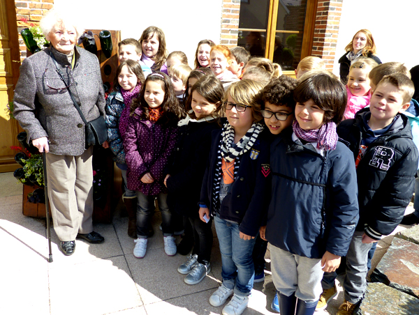 Yvette Lundy au milieu des enfants des classes de CE1 et CE2 de l'école de Chouilly