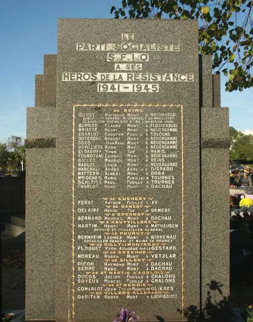 La stèle érigée dans le Cimetière du Nord de Reims par la Fédération marnaise du Parti socialiste SFIO « à ses héros de la Résistance », pour honorer la mémoire des 29 résistants socialistes marnais morts en déportation, fusillés, torturés à mort ou tués au combat de 1941 à 1945, a été inaugurée le 4 mai 1947 par Pierre BLOCH, membre du Comité directeur de la SFIO et ancien ministre.