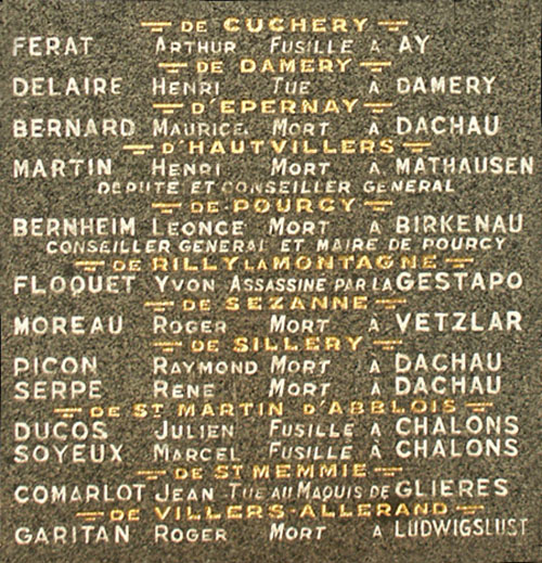 Arthur FÉRAT a été tué lors de la Libération d'Ay, le 28 août 1944. Henri DELAIRE a été tué dans les combats de la Libération de Damery, fin août 1944. Maurice BERNARD est décédé à Dachau, le 25 février 1945. Henri MARTIN est décédé à Mauthausen le 9 mai 1945, quelques jours après la libération du camp. Léonce BERNHEIM est décédé à Auschwitz-Birkenau, gazé avec son épouse Renée, le 20 décembre 1943, dès l'arrivée du convoi n° 63. Yvon FLOQUET est décédé à la prison de Reims, le 23 février 1944. Roger MOREAU, requis du STO, est décédé à Wetzlar près de Francfort sur le Main. Raymond PICON est décédé dans le transport du 2 juillet 1944 vers Dachau dit « Train de la mort ». René SERPE, déporté par le même transport, est décédé à Dachau, le 22 avril 1945. Julien DUCOS et Marcel SOYEUX ont été fusillés à L'Épine le 19 f'évrier 1944. Jean COMARLOT, réfractaire au STO qui a rejoint le maquis des Glières, a été fait prisonnier et fusillé le 30 mars 1944. Roger GARITAN a été déporté à Neuengamme, puis évacué à Wöbbelin où il est décédé le 14 avril 1945. Chaque année, le 30 août, jour anniversaire de la libération de Reims, les militants socialistes viennent se recueillirent devant le monument, déposer une gerbe et procéder à l'appel des camarades « Morts pour la France ».
