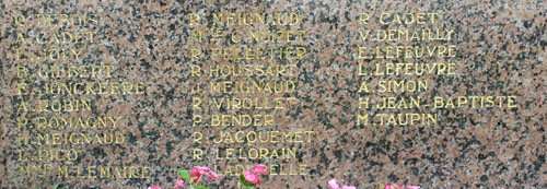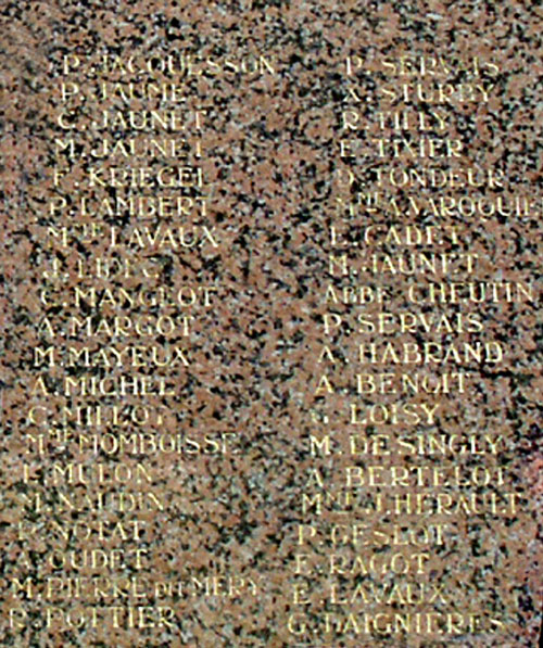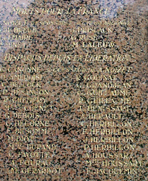 - 97 « Disparus depuis la Libération » : C. CANONNE successeur d'André Noizet, D. AMEROISE, C. BELLOCK, P. BESANÇON, R. CHÉMERY, Mlle CHENET, G. DEBOIS, C. DECORNE, E. DESOMME, M. DIOT, Mme DURAND, C. FAVOTTE, A. FOURAU, M. GÉRARDOT, R. GODINAT, G. GRANDJEAN, G. GUILLAUME, R. GUILLAUME, L. HÉNISSART, A. HÉRAULT, C. HERBILLON, F. HERBILLON, J. HERBILLON, P. HERBILLON, A. HOUSSART, Mme HOUSSART, F. JACQUEMIN, P. JACQUESSON, P. JAUME, C. JAUNET, M. JAUNET, F. KRIEGEL, P. LAMBERT, Mme LAVAUX, J. LIDEC, C. MANGEOT, A. MARGOT, M. MAYEUX, A. MICHEL, C. MILLOT, Mme MOMBOISSE, L. MULON, M. NAUDIN, P. NOTAT, A. OUDET, M. PIERRE dit MÉRY, R. POTTIER, P. SERVAIS, X. STURBY, R. TILLY, E. TIXIER, D. TONDEUR, Mme A. VAROQUIER, E. CADET, M. JAUNET, Abbé CHEUTIN, P. SERVAIS, A HABRAND, A. BENOIT, G. LOISY, M. DESINGLY, A. BERTELOT, Mme J. HÉRAULT, P. GESLOT, E. RAGOT, E. LAVAUX, G. DAIGNIÈRES, R. DESBOIS, A. CADET, L. JOLY, D. GILBERT, E. JONCKEERE, A. ROBIN, P. ROMAGNY, H. MEIGNAUD, L. PICQ, Mme M. LEMAIRE, R. MEIGNAUD, Mme C. NOIZET, R. PELLETIER, R. HOUSSART, J. MEIGNAUD, R. VIROLLET, P. BENDER, R. JACQUEMET, R. LELORAIN, R. LADURELLE, R. CADET, V. DEMAILLY, E. LEFEUVRE, L. LEFEUVRE, A. SIMON, H. JEAN-BAPTISTE, M. TAUPIN, R. CADET, H. MULON, J. VIROLLET.