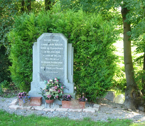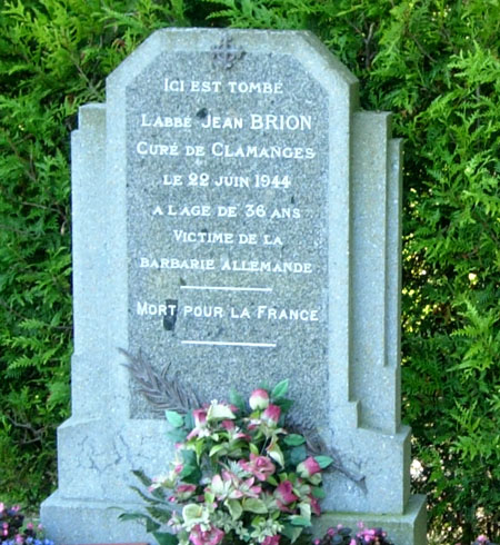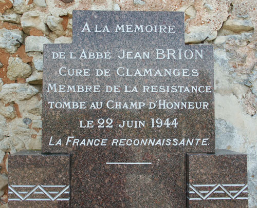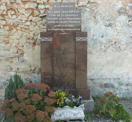 stèles Un première stèle érigée à la mémoire de l'abbé Jean BRION, membre actif de la Résistance abattu par la Gestapo venus l'arrêter le 22 juin 1944, se dresse à la droite du portail de la petite église de Clamanges paroisse du diocèse de Châlons-sur-Marne située à une quinzaine de kilomètres au Nord-Est de Fère-Champenoise.