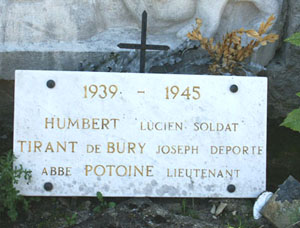 Une autre plaque commémorative a été érigée au lendemain de la 2e guerre mondiale à gauche du portail de la ferme pour honorer la mémoire de Joseph TIRANT DE BURY, agent P2 du réseau d'évasion Possum, qui a hébergé chez lui plusieurs pilotes alliés. Arrêté le 21 juin 1944, il a été déporté en juillet 1944 au camp de concentration de Neuengamme. Affecté au Kommando de Bremen-Farge, il y est décédé le 17 septembre 1944.