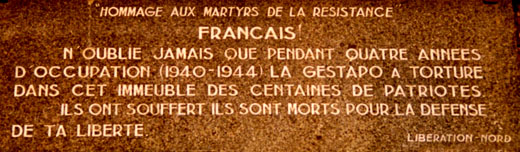 Une plaque commémorative fut érigée à l'initiative de Libération-Nord sur la façade du mur d'entrée .