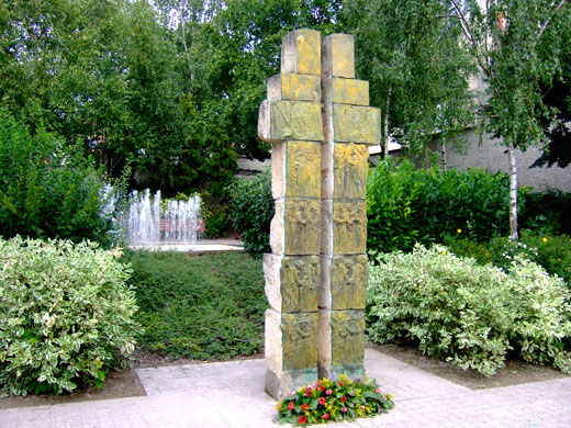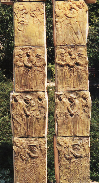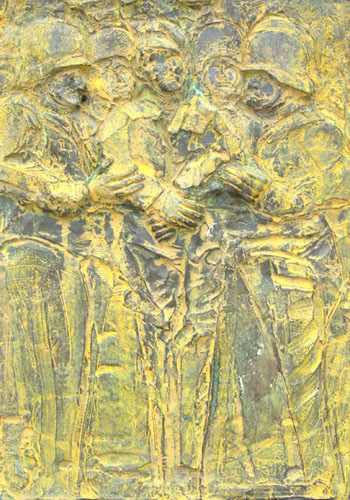 ... seront ensuite scellées des feuilles de bronze patinées qui rappelleront les victimes de la gestapo, personnages tendus, verticaux, suggérant l'histoire de la résistance et de la déportation.