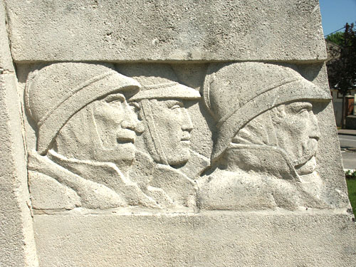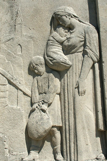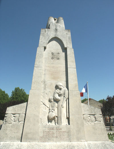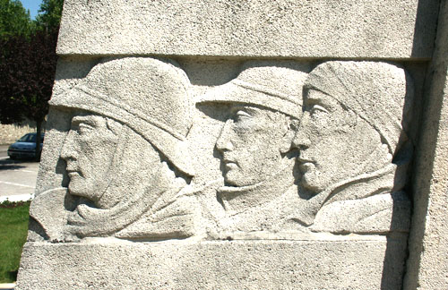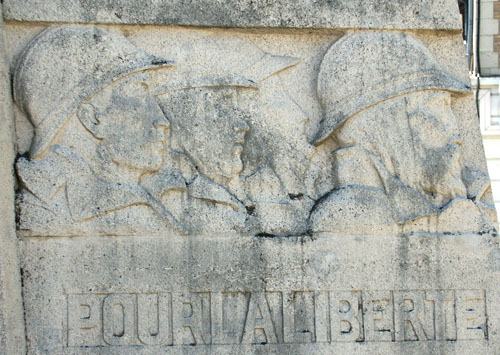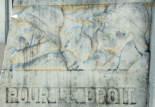 Bas-relief droit La face sud du monument perpétue le souvenir des épreuves subies par la ville au cours de la Première Guerre mondiale, de la citation à l'ordre de l'Armée qui lui a été décernée à ce tître, et des victimes civiles des deux guerres mondiales.