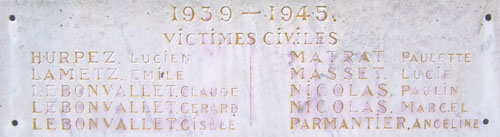 La liste des victimes civiles de 1939-1945 Parmi les victimes civiles de la Seconde Guerre mondiale, figurent les trois membres de la Famille NICOLAS, Paulin, Angeline et leur fils Marcel, membres du groupe Robin-Buckmaster, arrêtés en juillet 1943 à Thibie et morts en déportation en 1944, dont une plaque commémorative dressée face au monulent rappelle qu'« ils sont morts pour que vive la France ».