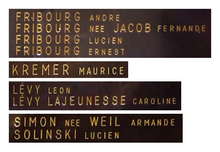 - « FRIBOURG André » (40 ans), fils de Lucien et Fernande FRIBOURG, déporté à Auschwitz par le convoi 1 du 27 mars 1942.
