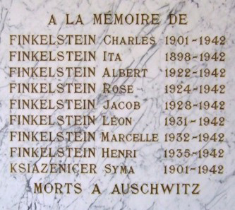 - « FINKELSTEIN Charles » (41 ans ), son épouse « FINKELSTEIN Ita » née WAJNTRAUB (44 ans), déportés à Auschwitz par le convoi 11 du 27 juillet 1942 avec leurs deux aînés « FINKELSTEIN Albert » (20 ans) et « FINKELSTEIN Rose » (18 ans ; leurs quatre autres enfants « FINKELSTEIN Jacob » (14 ans), « FINKELSTEIN Léon » (11 ans), « FINKELSTEIN Marcelle » (10 ans) et « FINKELSTEIN Henri » (7 ans), déportés à Auschwitz par le convoi 40 du 4 novembre 1942.