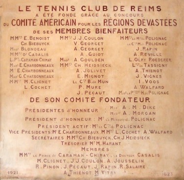 Dans le hall d’entrée du Tennis-Club de Reims 15, rue Lagrive, une plaque commémorative rappelle que le Tennis Club de Reims a été fondé grâce au concours du Comité américain pour les régions dévastées et de ses membres bienfaiteurs, dont Melchior de Polignac et son épouse, et que le marquis faisait partie de son comité fondateur en tant président d’honneur.