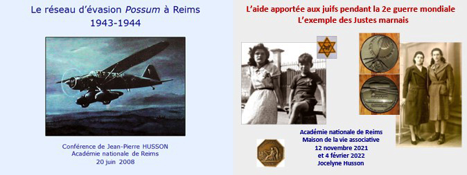 Membres titulaires de l’Académie nationale de Reims, nous avons donné deux conférences sur " Le réseau d’évasion Possum à Reims 1943-1944 " en 2008 et sur " L’aide apportée aux juifs pendant le 2e guerre mondiale. L’exemple des Justes marnais " en 2021 et 2022.