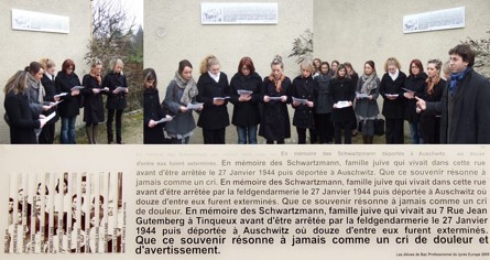 En 2008-2009, nous avons accompagné les élèves de bac pro du lycée Europe de Reims dans la réalisation sous la direction de leurs professeurs Vincent COUSINA et Sylvain BASTIANCIG d'une plaque commémorative apposée à Tinqueux pour honorer la mémoire de la famille SCHWARTZMANN, à laquelle nous avons consacré un dossier bien documenté sur le site « Histoire et mémoire 51 ». Les parents et leurs douze enfants déportés à Auschwitz par le convoi numéro 67 du 3 février 1944, ont été tous gazés dès leur arrivée au à Birkenau à l'exception de Suzanne et de Léa, les deux filles ainées, sélectionnées pour le travail forcé, qui ont survécu à la Shoah.